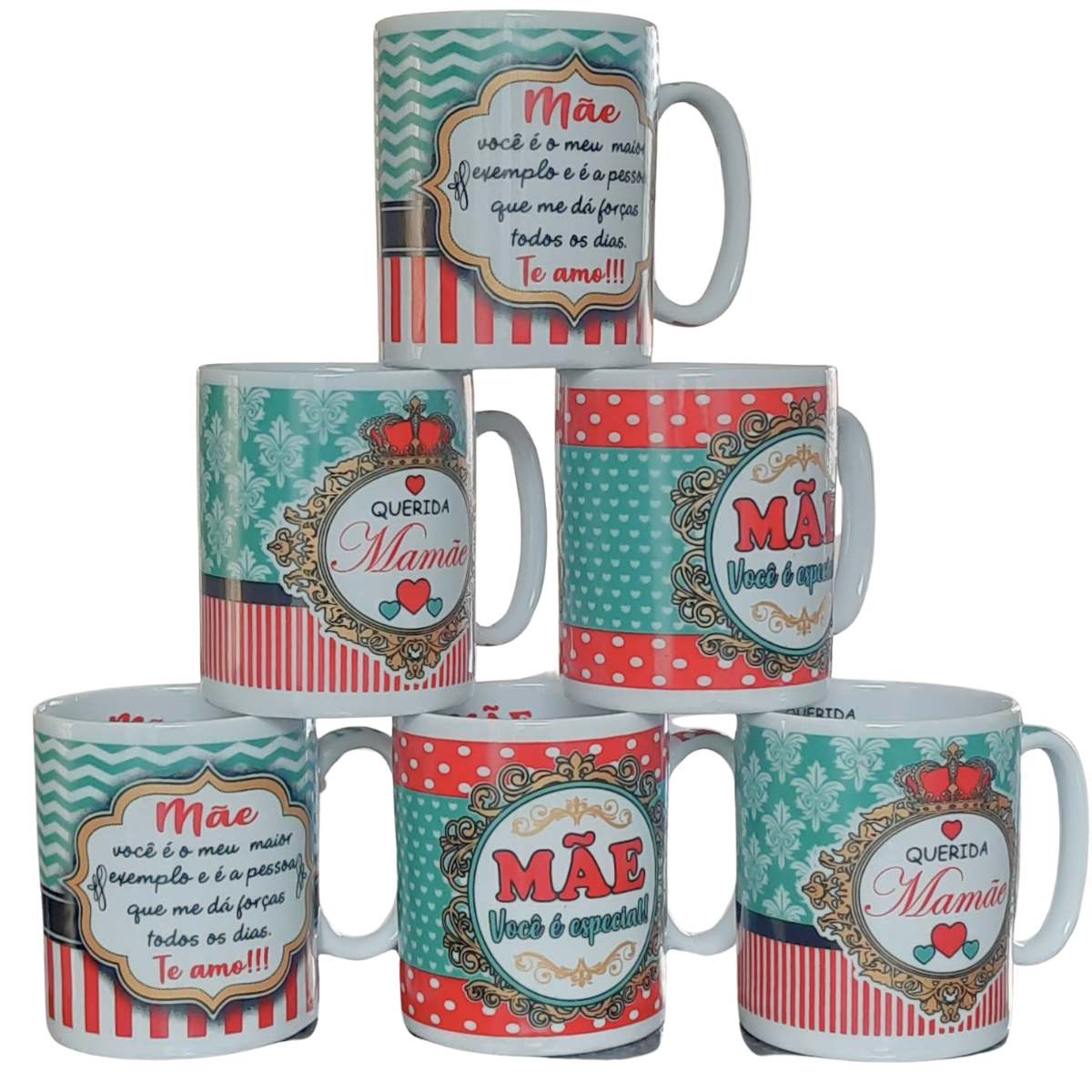 Jogo 6 canecas 300ml Frases Mãe - Kit Porcelana - Decoração Caneca Completa Verde e Vermelho