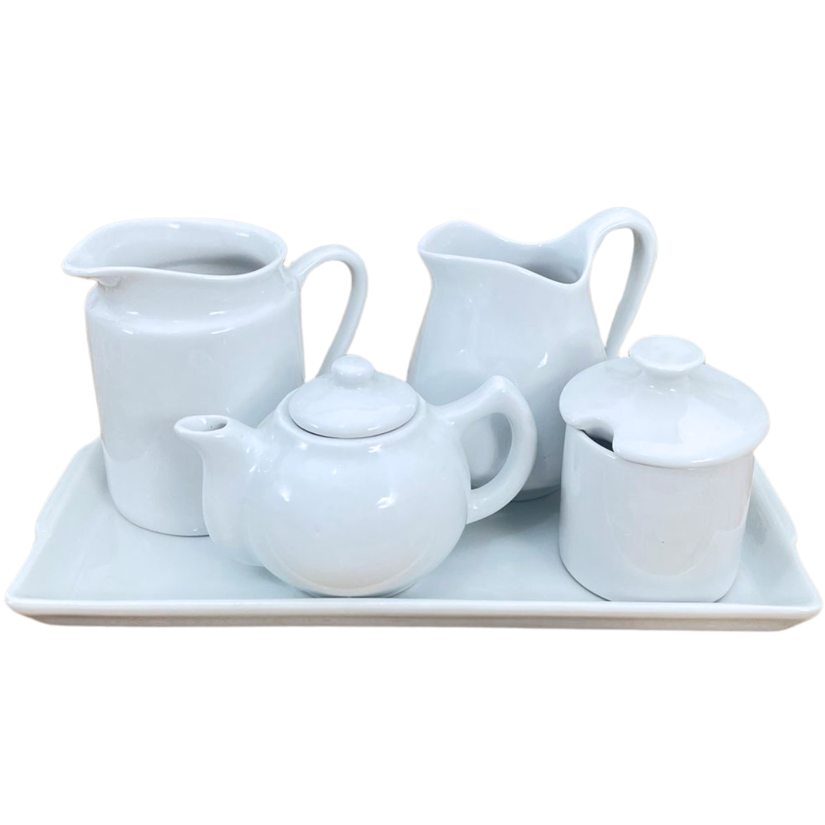 Jogo Café e Chá Mesa Posta, Bandeja + Bule Chaleira 400ml + Açucareiro 250ml + Jarra Leiteira 740ml + Jarra Suco 800ml - Kit Porcelana Branca
