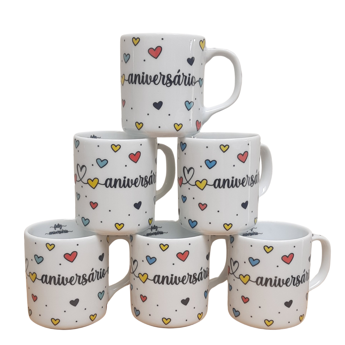 Kit Jogo 6 canecas 300ml Feliz Aniversário - Porcelana
